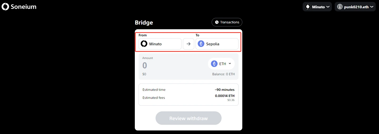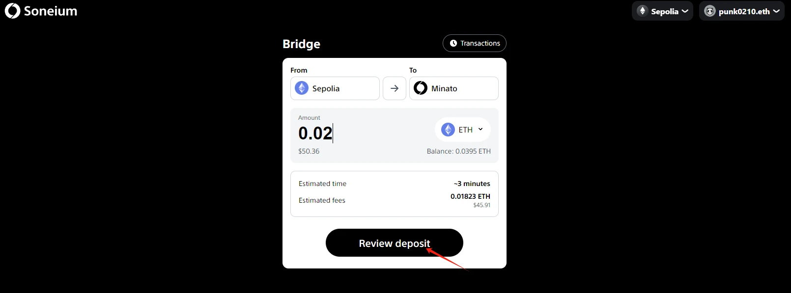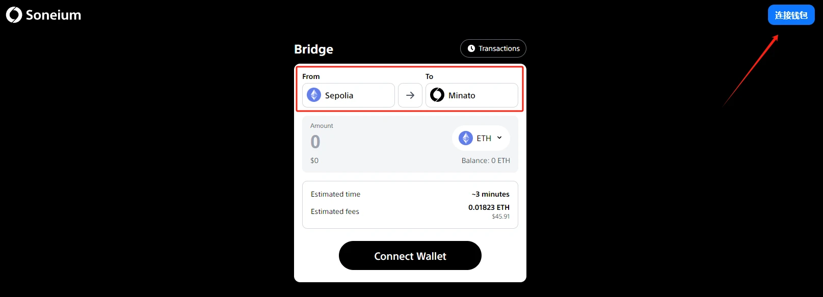 STEP 1. 将 ETH 从 Sepolia 跨至 Minato( 点击此处跳转官方跨链桥 )。
