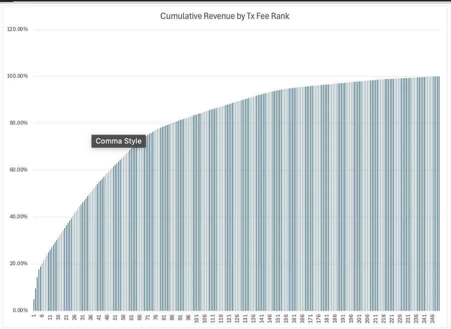 下面是从 Base L2 随机抽取的 5 个区块的交易分布。这呈现出明显的帕累托分布,使得价格区分极为有效。前 10% 的交易支付了 30% 的收入,而后 10% 的交易支付不到 1% 。