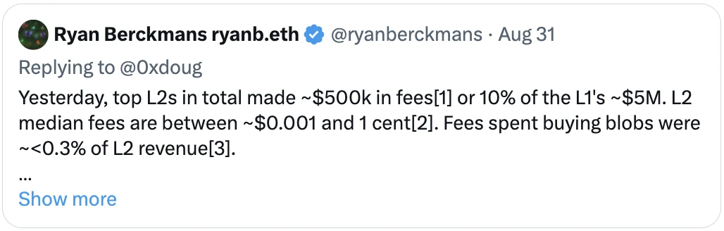 高价值且对价格不敏感的用户会选择 L1,因为它具有持久性、安全性和最终性,而 L2 则专注于那些因 L1 费用过高而被排除的边际低价用户。因此,以太坊仍能获得可观的排序器租金。