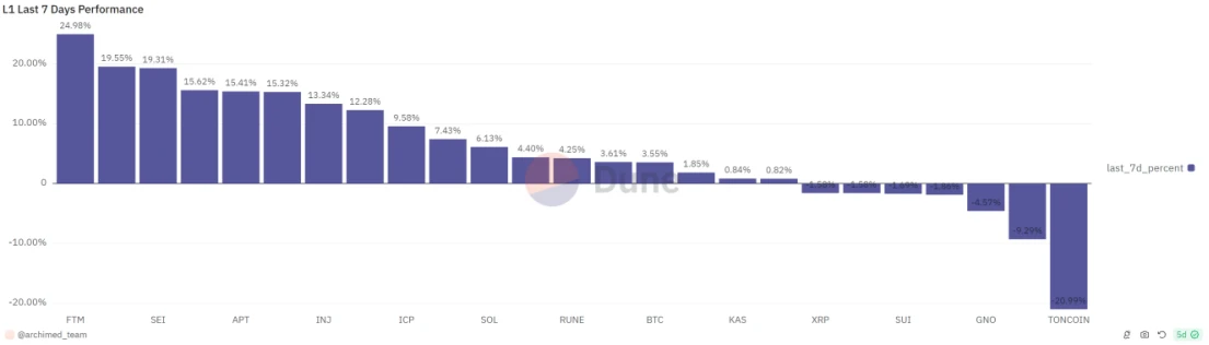而老牌公链 Fantom 意外成为上周表现最好的公链,这或得益于其更名后的 Sonic Labs 即将上线新版测试网的利好消息。当然,AC 被任命为 CTO 也是给 Fantom 的用户吃下一颗定心丸。