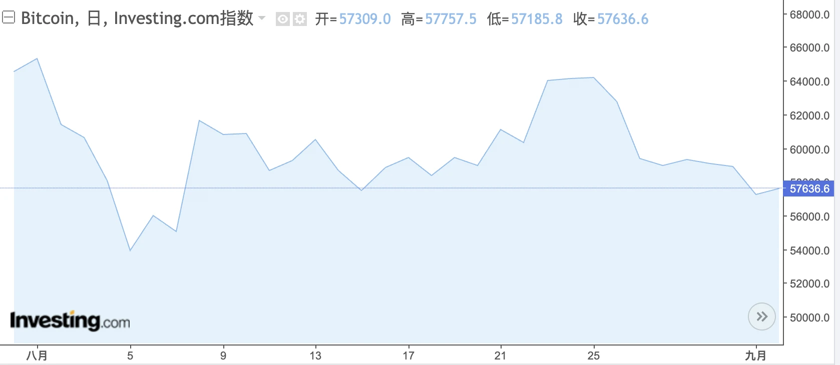 加密市场上周呈现波动性下跌趋势。比特币、以太坊的周内跌幅均在 10% 左右,比特币盘中一度触及 57, 230 美元的低点。数据显示,比特币 8 月份跌幅达 8.6% 。