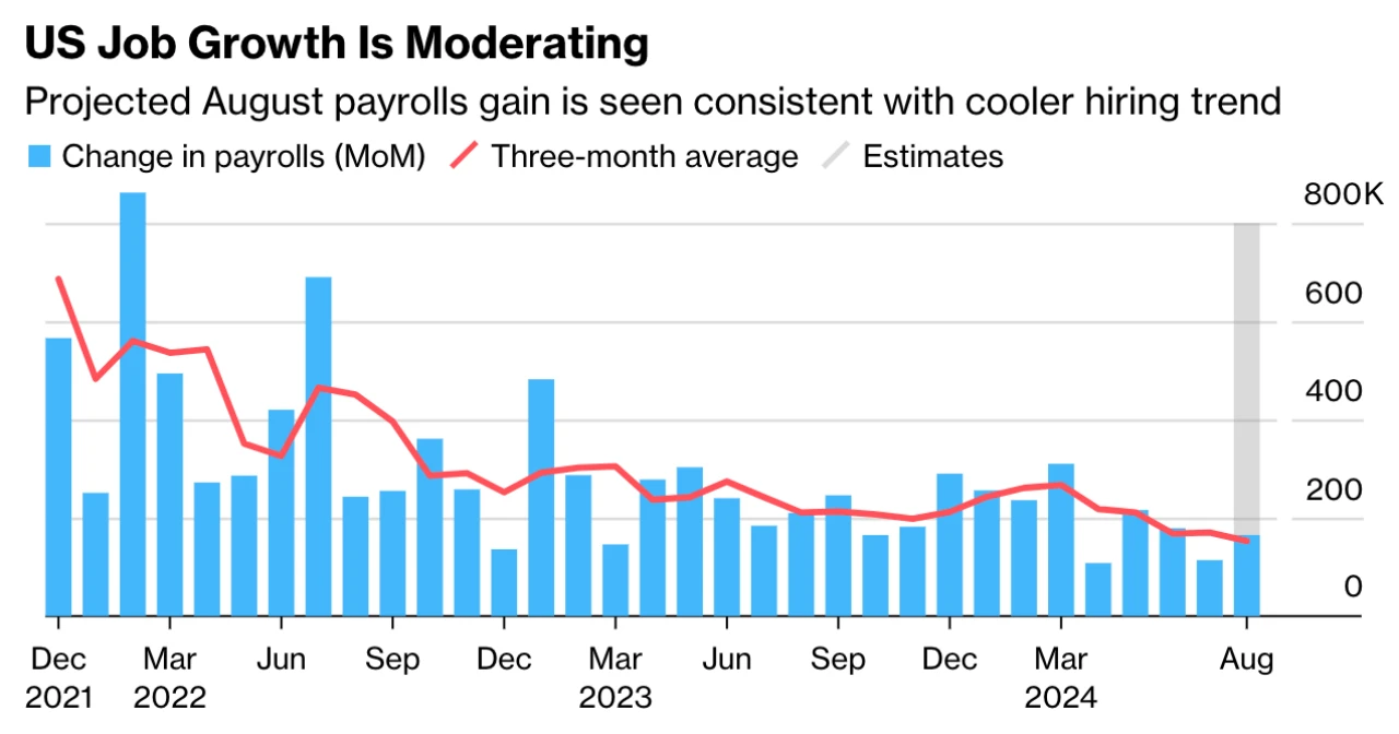 本周的焦点将是美国非农就业报告。美联储主席鲍威尔暗示 9 月降息,因通胀放缓和劳动力市场温和增长。