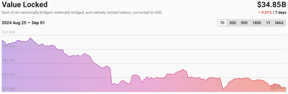 其中值得被注意的是 Blast,Blast 的总锁定价值(TVL)从历史最高点下跌 62% ,每日活跃用户数量降至六个月来的最低水平。8 月初,该网络流失了超过 3 亿美元的流动性,TVL 从 11 亿美元降至 7.85 亿美元,为六个月以来的最低点。
