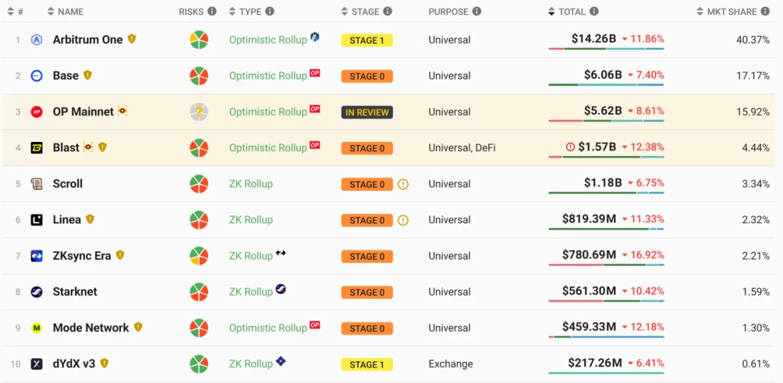 本周随着整个市场再度疲软,L2资金全体出逃,整体 TVL 单周净流出接近 10% ,前十大协议中,除开近期始终强势的 Base、ZK 系的龙头 Scroll 以及 OP 主网跌幅低于 10% 以外,其余协议均跌幅达到 10% 以上。
