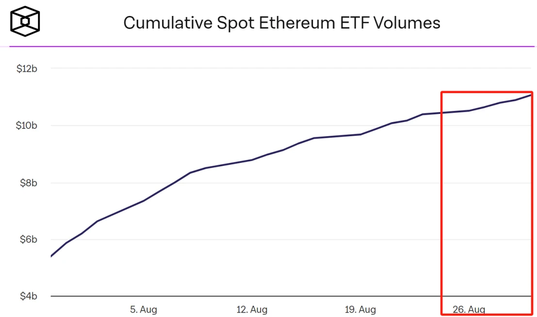 ETH 买家显然在上周的买入情绪仍然低迷,从图表看几乎趋平,各大 ETF 单周买入额总计甚至未达到$ 1 B,可见资管巨头目前对于 ETH 作为其资产配比的意愿和比例都偏低,ETH 想成为“数字白银”的道路仍然艰辛。