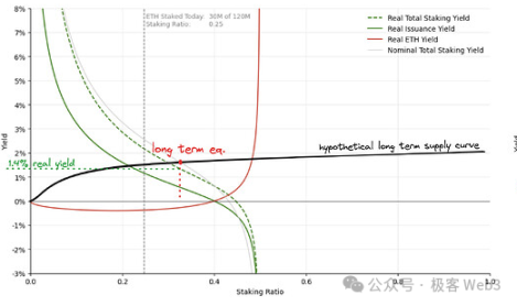 任何质押者在同一质押政策下,一定会选择对自己来说实际收益更高的策略。但在以太坊的协议设计中,用户根本无法选择,因为协议的发行曲线决定了质押的最终均衡状态(长期质押供给曲线固定的情况下),出于收益考虑,任何用户只能选择参与质押这一种策略。