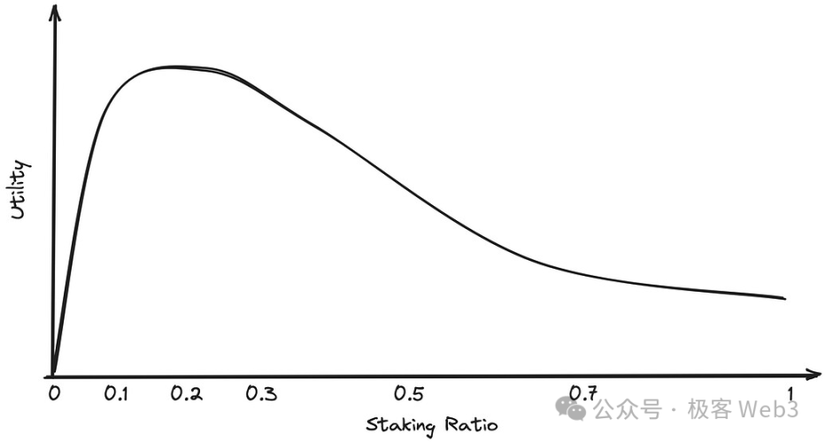 该问题的核心在于权衡——较低的质押参与度会增加协议受到攻击的风险,而过高的质押参与度则可能带来负外部效应。为了更好地确定质押区间,我们可以对不同质押比例下的效用进行建模。一种可能的效用曲线如下所示: