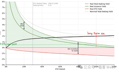 总质押收益曲线(绿色虚线):ETH 的固定增发收益加上 MEV 收益,构成了质押者的总质押收益。这里要注意,MEV 收益率的计算方式为:MEV 收益总量(去年约为 30 万个 ETH)除以被质押的 ETH 总量。