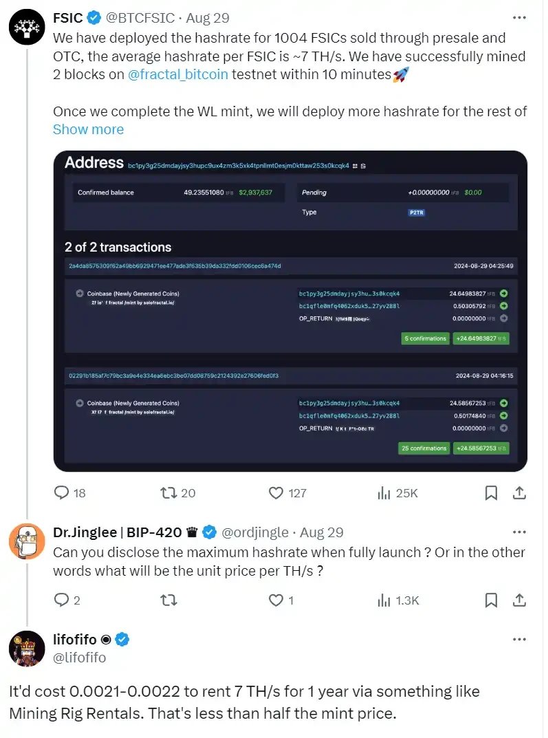 - $FB 挖矿将在 Fractal 主网正式上线后一周才开始(最理想的时间预计),而 FSIC 将从主网上线第一天就开始。由于他们是实打实自己购买矿机,因此部署新的矿机需要时间。