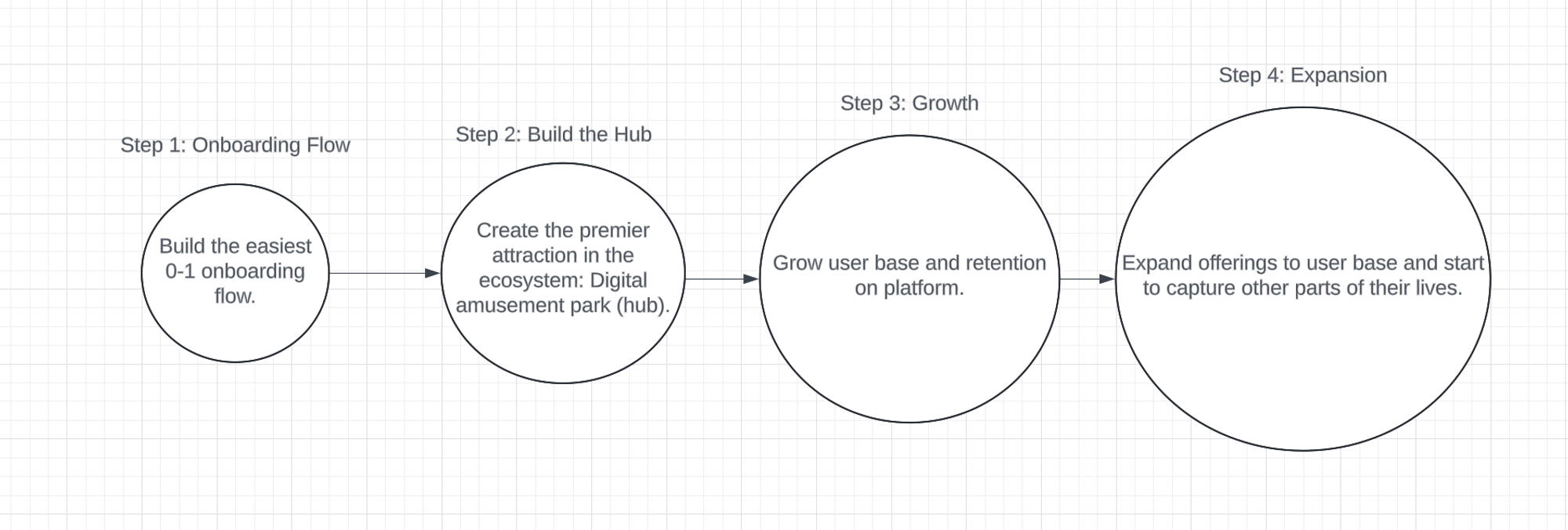 我们团队致力于在链上创建一个顶级目的地,一个被设计为互联网最有趣的地方——我称之为“加密的数字游乐园”或“互联网的迪士尼乐园”。下面的图示突显了我们专注于提供卓越的 0-1 消费者体验的坚定决心,不受其他因素干扰。随着时间的推移,通过引入涵盖人们生活各个方面的新产品,我们建立了忠实的用户群后,可以逐步发展成为一个通用链。对我们而言,这是一种高度集中的策略,先实现具体的成功,然后再扩展,与通用链的碎片化方法相比更具优势。