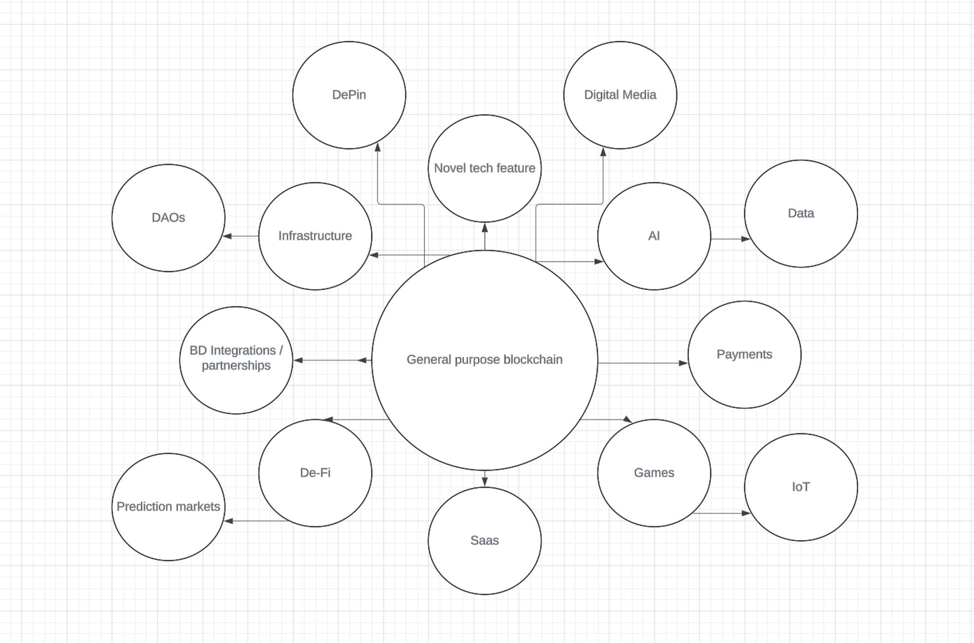 在过去的十年中,推动消费者普及的责任一直由那些筹集了数百亿美元的区块链项目承担。不幸的是,只有少数项目在这一过程中取得了成功。我认为原因在于他们构建的理念。许多区块链公司采用的是一种从零到一百的“通用”策略,雄心勃勃地想成为下一代互联网经济的基础设施。下面是一个关于通用区块链如何进行增长和优先级的示意图。