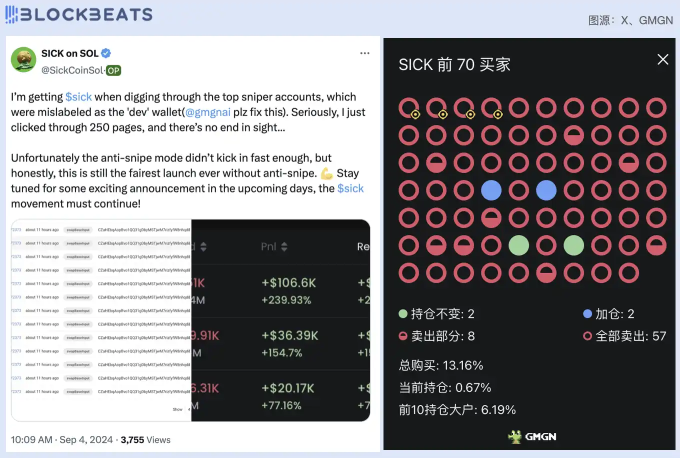 GMGN 向 BlockBeats 表示,对 dev 小号的判定依据为开盘时前几个块的交易者。记录显示,有四个狙击者地址被判定为 dev 小号,他们在 SICK 上的盈利倍率在 100%-300% 之间。如果说普通交易者能够学到什么,就是不仅要对项目方描绘的愿景保持警惕,还要分辨项目方划定的玩法规则。