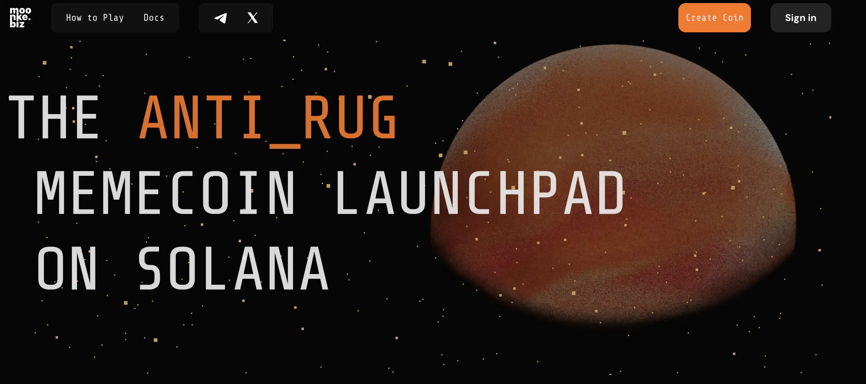 在 Moonkebiz 的官推中,介绍其使命为革新 Pump.fun 上泛滥的 meme rug 现象。进入 Moonkebiz 主页,首先看到其 slogan 为「Solana 上没有 rug 的 meme 发射平台」。