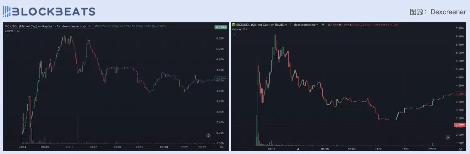 昨夜,BlockBeats 小编也蹲守了 SICK 的开盘时刻。SICK 宣布的上线时间为 23 时,但根据 Dexcreener 和 GMGN 看,合约真正发射时间为 23 时 13 分 59 秒,Dexcreener 数据显示,开盘两分钟后 SICK 的市值就冲到了 550 万美元左右。之后,SICK 在 4 分钟里急速下跌 37% ,然后转而持续上涨 13 分钟,币价翻倍。此时距开盘仅过去了 20 分钟。