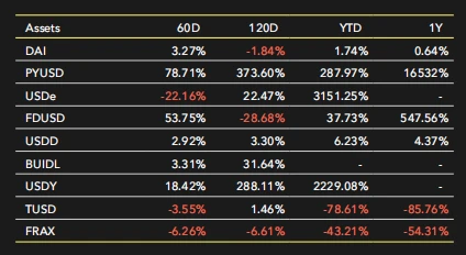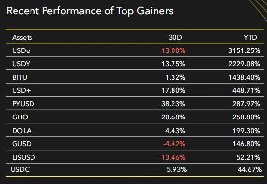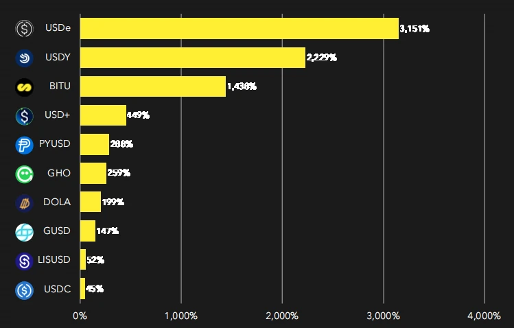 今年以来,市值超过 $ 10 M 且增长速度较快的稳定币前五名包括: USDe, USDY, BITU, USD+, PYUSD.
