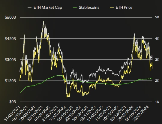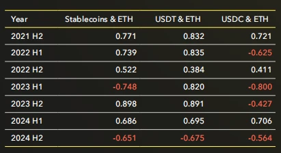 2024 H 2 截止到八月底的数据显示,目前 ETH 和稳定币市值的相关性都为负数。稳定币的市值持续增长,但是 ETH 的市值/价格却没有 这个趋势, 稳定币的流入并没有进入 ETH 的市场中。