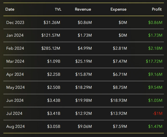 其中 Revenue 指的总收益数据, Expense 指的是将收益分配给用户 (一般是 sUSDe 的持有人)的量,剩余的则是归团队所有的利润