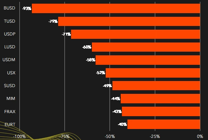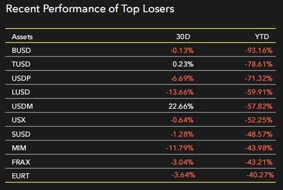除此以外,Top Losers 里面 有一半 的项目都属于相对 Native 的 DeFi 项目: LUSD (Liquidity), USX (dForce), SUSD (Synthetix), MIM (Abracadabra.money), FRAX (Frax).
