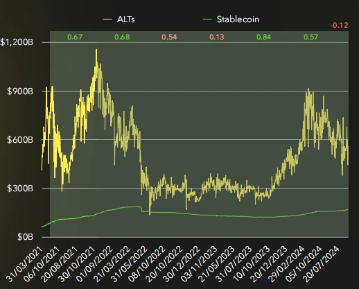 2024 H 2 截止到 8 月底的数据仍旧展示出了 ALTs 与稳定币市值为负的相关性。
