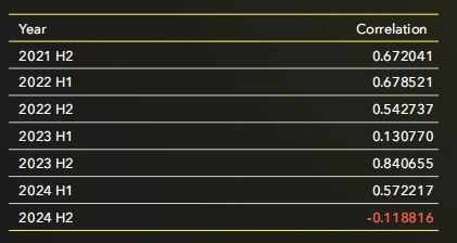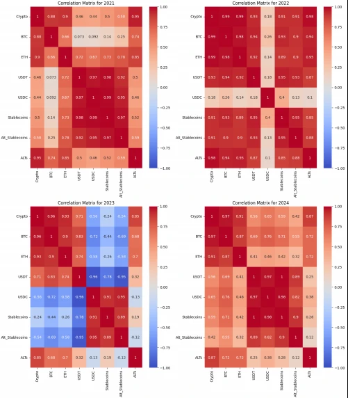 在最近的时间, 2024 H 2 ,USDT 和 BTC 的相关性降低的非常明显。可能的一部分原因是 2024 H 2 的数据目前只有截止到八月底。