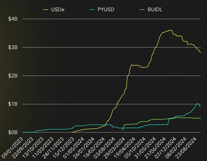 在过去的一年时间中,除去头部的 USDT, USDC 和 DAI 以外,有三个 增长相对较为迅速的项目,分别是 USDe, PYUSD 以及 BUIDL。