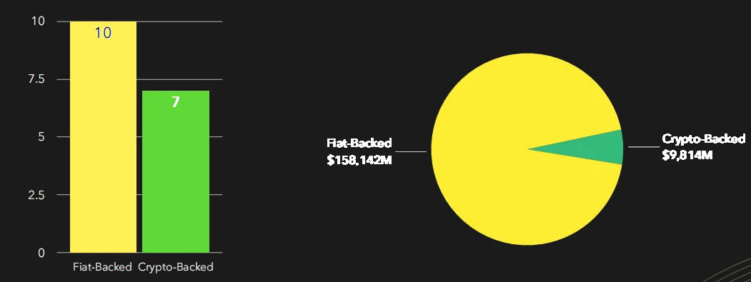 市值方面,法币背书的稳定币占据 94.16% ,Crypto 资产背书的稳定币占比 5.84% 。