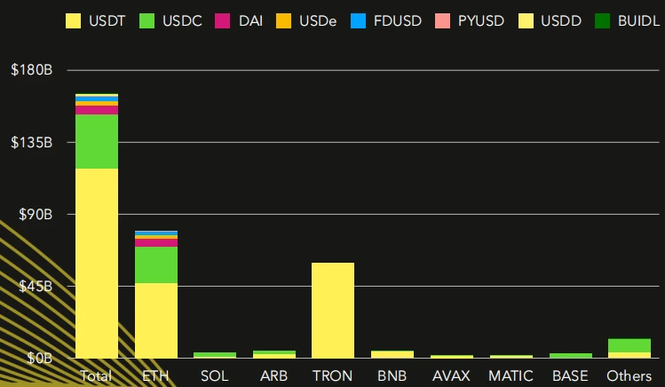 当然,需要注意的是,TRON 上所有的稳定币基本上都是 USDT,⽽ ETH 或其他较⼩的⽣态,在稳定币的种类⽅⾯都有更多多样性。
