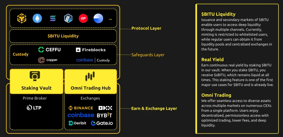 BitU Protocol 使用户能够铸造 $BITU,这是一种安全且稳健的美元挂钩稳定币,旨在通过最小化波动风险为用户提供稳定的收益。用户可以质押 $BITU 并获得 $sBITU 以赚取真实收益。 $BITU 还可以用作全能交易中心的抵押 品,该中心从一个交易终端为多个中心化交易所提供深度流动性。