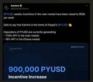 PYUSD 的快速增长核心原因在于其官方补贴的 PYUSD 奖励, 每周提供 90 万美元。 这使得仅仅是存款的 APY 就能够达到两位数,高的时候 接近 20% 。