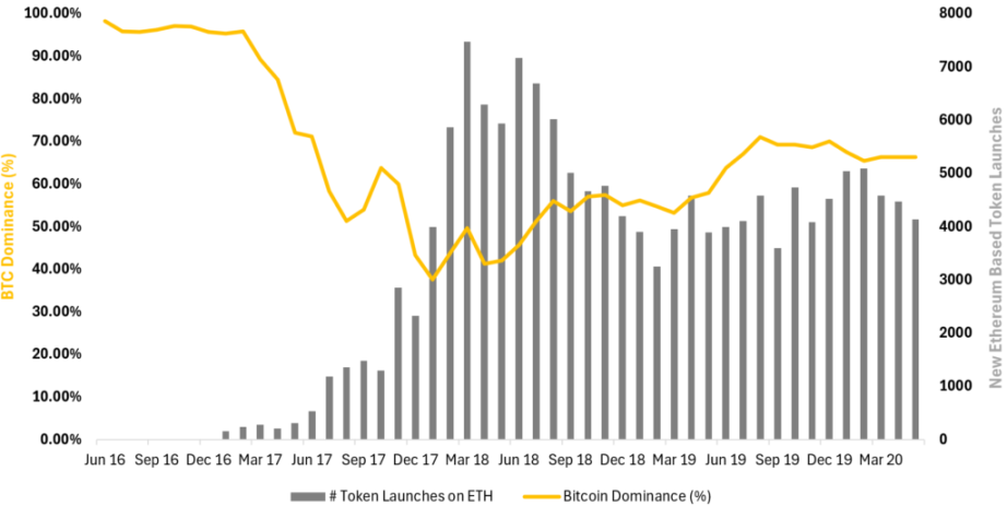 对于那些当时就参与进来的市场玩家来说,大家都知道是什么真正推动了那段时期交易量的增加。回顾一下:在 2015 年以太坊推出及其智能合约功能解锁之后,随之而来的是 ICO 热潮,这导致了许多新代币在以太坊平台上创建。这些新代币的涌现促成了比特币主导地位的下降。