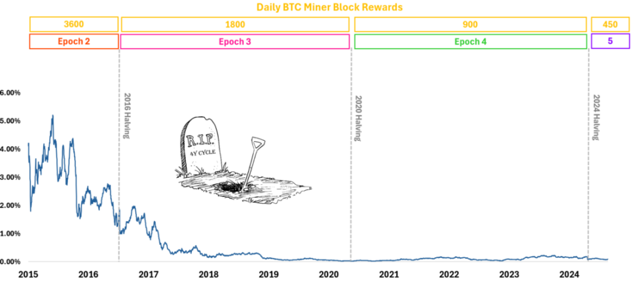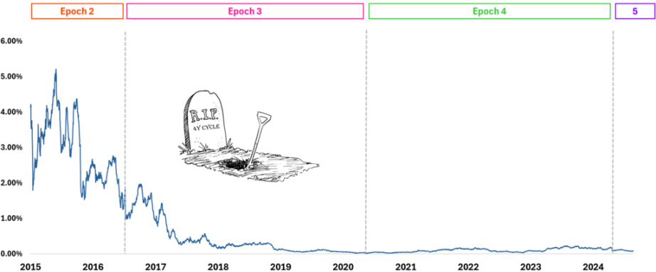 我认为, 2016 年及进入 Epoch 3 时的减半是最后一次减半对市场产生真正有意义影响的时候。 如图 2 所述,下图展示了如果所有矿工在获得区块奖励的当天全部出售其比特币的情况下,对市场的影响。可以看到到 2017 年中期,这一影响下降到了 1% 以下,而今天这个比例勉强超 0.20% ,表明其影响力已无足轻重。
