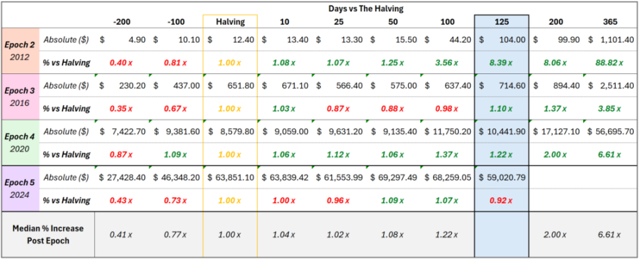 首先,让我们回顾一下减半前后比特币在最近几个周期的价格表现。显然,在 125 天后的数据中,第 5 个 Epoch(2024 年)自减半以来表现最差,这是比特币在减半日价格基础上首次出现下跌的周期。