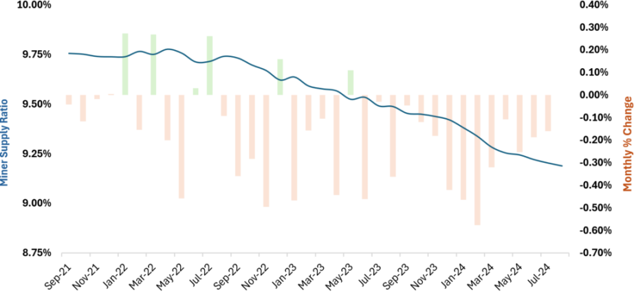 如图所示,矿工供应比率随着时间的推移稳步下降,目前约为 9.2% 。最近,矿工的场外交易活动有所增加,他们出售比特币,可能是为了避免对市场价格产生过大的影响。这一趋势可能是由于区块奖励降低、硬件和能源成本上升以及比特币价格未显著上涨——迫使矿工们更快地出售比特币以保持盈利。