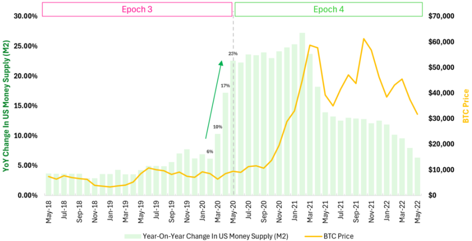 2020 年减半后比特币和加密市场的强劲表现纯属巧合,因为 2020 年减半恰逢全球在疫情后前所未有的资本注入期,仅美国的货币供应量(M 2)在当年就增加了 25.3% 。