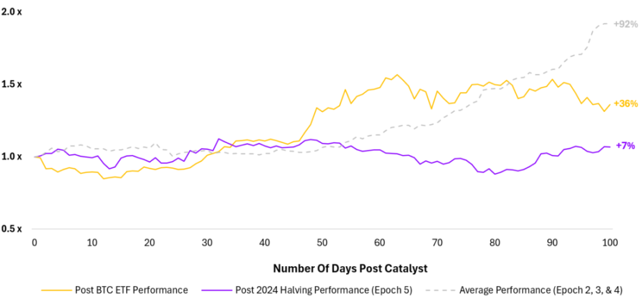 图 7 :减半和 ETF 催化剂后的 100 天比特币表现