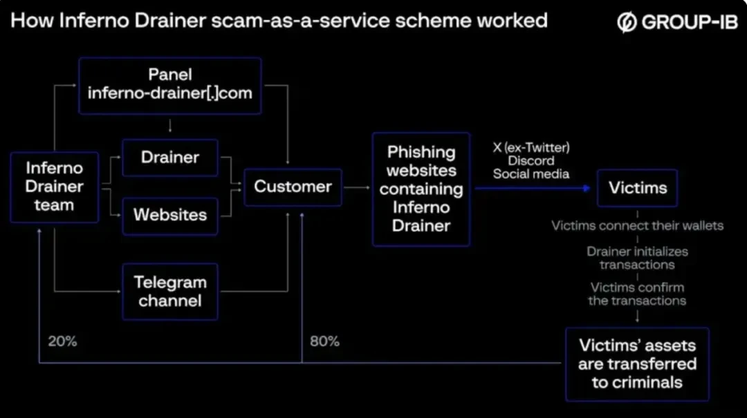该团伙通过电报频道推广其服务,以“诈骗即服务”的模式运营,由开发者提供钓鱼网站给诈骗分子,帮助他们实施诈骗活动。当受害者扫描钓鱼网站上的二维码并连接他们的钱包时,Inferno Drainer 会自动检查并定位钱包中最有价值且易于转移的资产,并发起恶意交易。一旦受害者确认交易,资产就会被转移到犯罪分子的账户中。被盗资产中, 20% 会分给 Inferno Drainer 的开发者,其余 80% 则归诈骗分子所有。