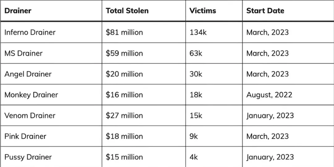 区块链中的“drainer”通常指一种恶意智能合约或脚本,其目的是通过欺诈手段从用户的加密钱包或账户中窃取资金。这类攻击通常发生在用户与假冒或被入侵的去中心化应用(dApp)或网站交互时,用户可能会在不知情的情况下授权该恶意合约对其资金的控制权限,比较知名的 drainer 犯罪团伙有以下: