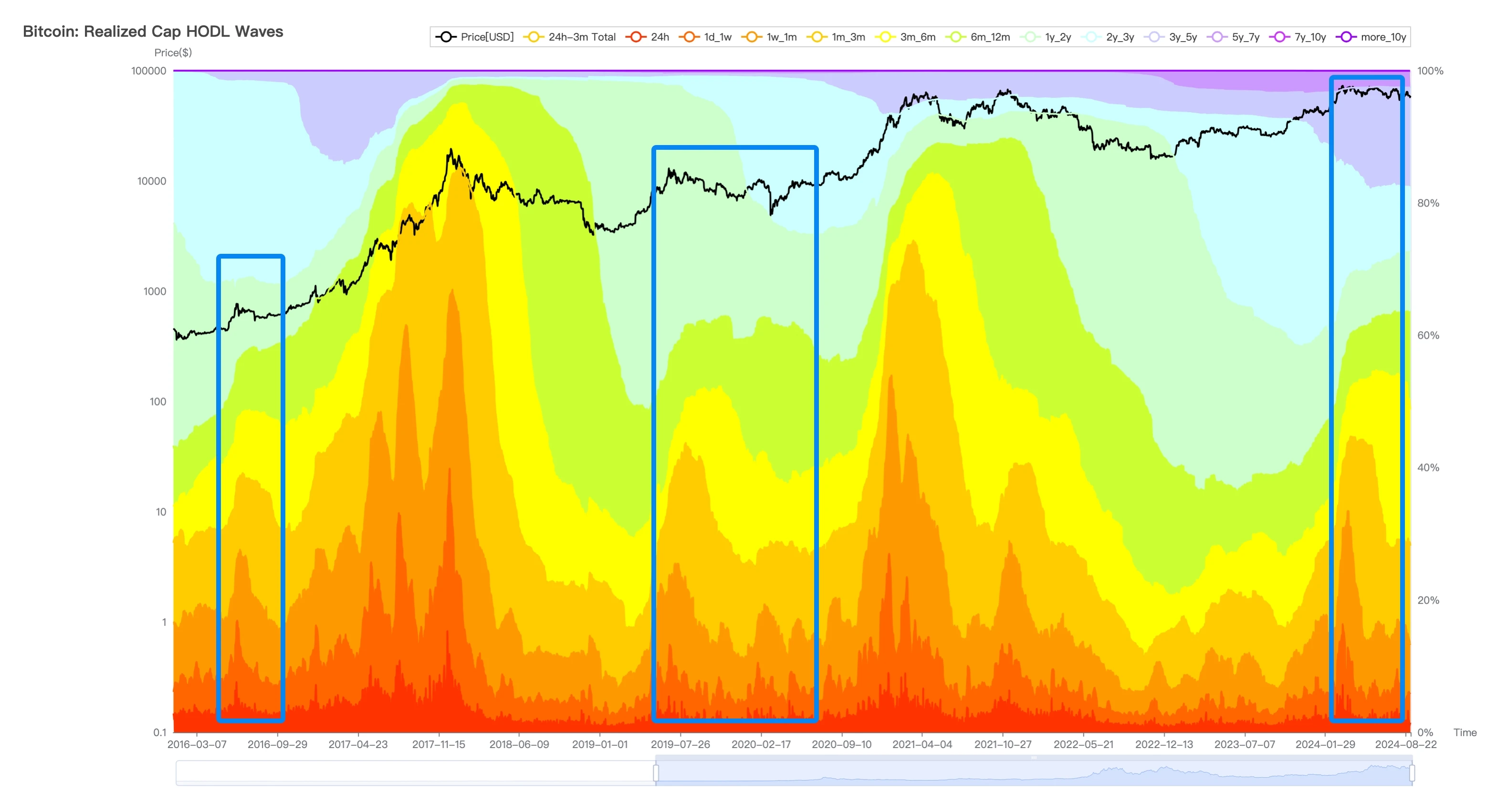 HODL Waves 显示 3 月内的新币已经迅速减少,这意味着投机活动大幅下降,而 3 ~ 6 月的次新币也在加速下行(也是新高整理区筹码的重要组成)。这些 BTC 持有者大部分在 ETF 批复之后进场,应属“单周期长手”。这意味着他们所持有的大部分 BTC 将转变为长手持仓, 8 月份长手持仓暴增 47 万即是明证。在可预见的未来数月,长手持仓依然会迅速增长。