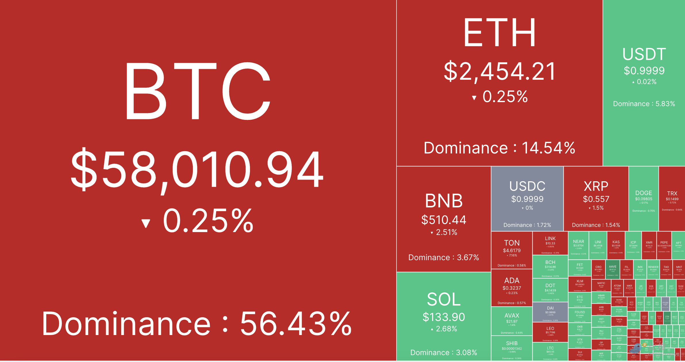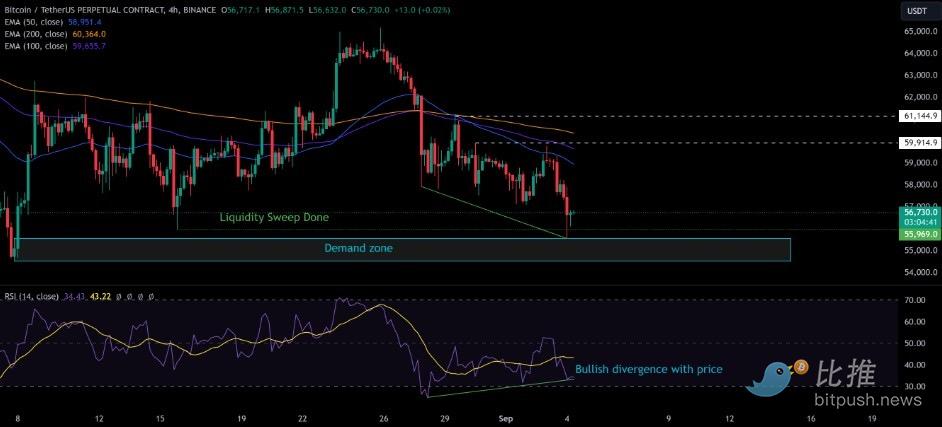 比推数据显示,比特币在周三凌晨跌破 56,000 美元的支撑位,触及 55,567 美元的日内低点,随后多头将其推回至 58,000 美元上方。截至发稿时,BTC 交易价格为 58,010 美元,24 小时跌幅 0.25%。