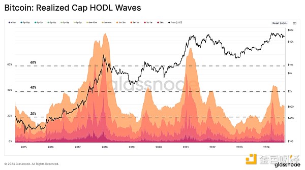 新投资者持有的财富百分比未达到之前 ATH 分配事件期间经历的高限值。这可能表明 2024 年的峰值更符合 2019 年的中期周期高点,而不是 2017 年和 2021 年的宏观高点。