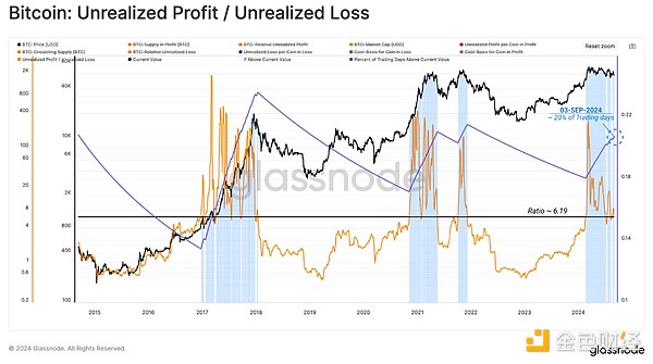 然而,即使对于这批人来说,他们的未实现亏损相对于市值的规模也尚未进入全面熊市,更接近于动荡的 2019 年。