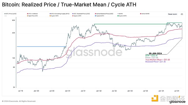 热情牛市:价格在 ATH 和真实市场均值之间交易。(橘色)