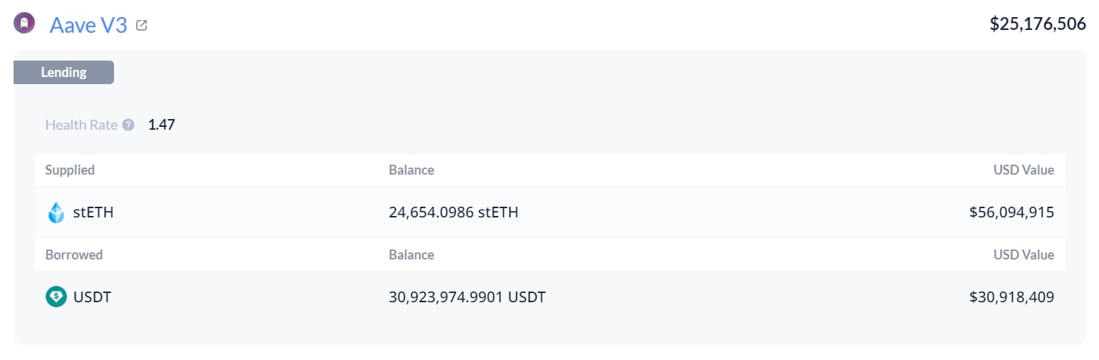 目前该地址仍持有 24,651 枚 stETH 作为保证金,价值 5609 万美元,借出 3091 万枚 USDT,健康度 1.48,当 ETH 跌至 1823 美元时将触发清算。