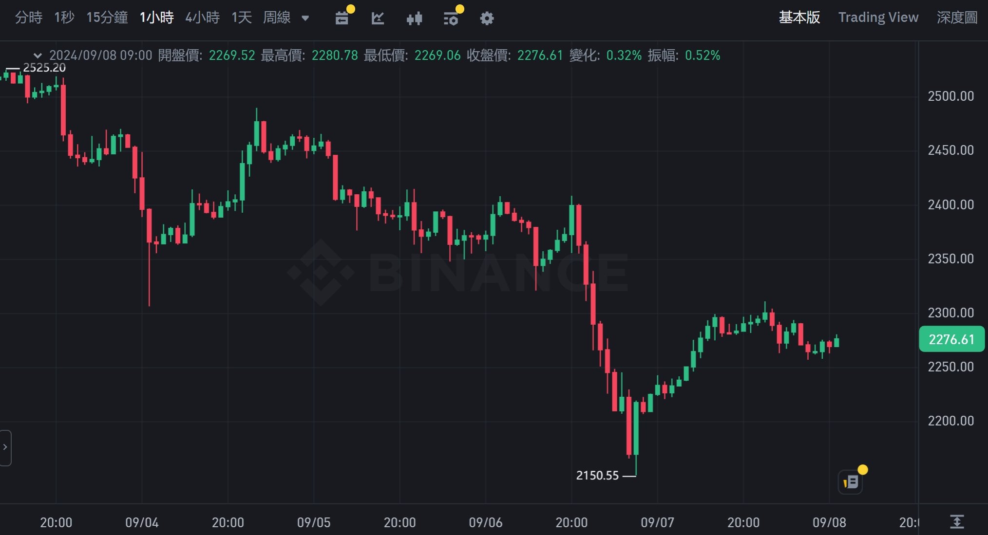 以太坊币价表现同样低迷,从 6 日起从 2400 美元附近一路下跌,最深在 7 日触及 2150 美元,同样创下 8 月 5 日来新低,目前略微回升至 2,276 美元,近 24 小时涨幅 2%。