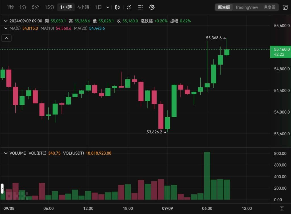 美 国上周公布的就业 数据 表现不佳,导致投资者对美国经济衰退疑虑加剧,比特币也在承压下一度在 7 日 跌至 5.3 万美元。不过从今(9)晨六点后,比特币于 54,400 美元𫔭始震盪走高,撰稿当下最高来到 55,368 美元,近 24 小时上涨 1.46%。