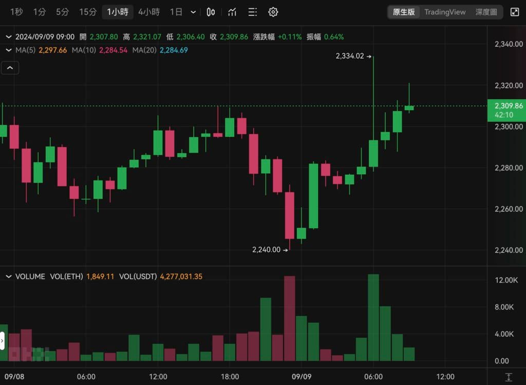 以太坊同样跟涨,今晨六点后最高触及 2,334 美元,撰稿当下报 2,309 美元,近 24 小时上涨 1.12%。