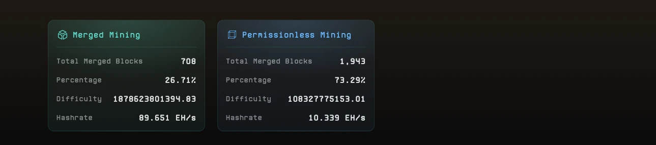 根据 Fractal 区块浏览器的数据显示,目前 Fractal 合并挖矿算力约为 90 EH/s,免许可挖矿算力为 10000 PH/s(1 EH/s= 1000 PH/s)。