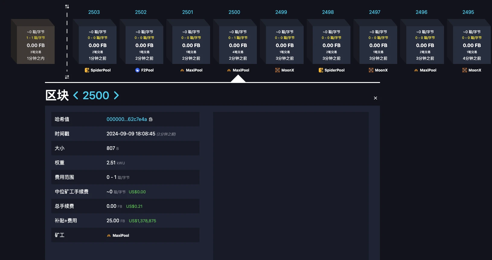 如下图,Fractal 主网启动 10 小时就开采出了 2500 个区块,产出了超 6.25 万枚 FB,这也就是说实际上随着算力的增加,区块的开采速度也在加快。每日真正的产量将会超过此前估计的 7.2 万枚。