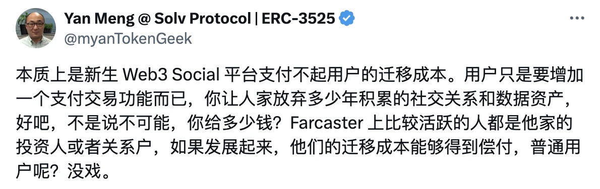 针对这一点,Solv Protocol 联合创始人 Yan Meng 今日曾在 X 评论表示:“本质上是新生 Web3 Social 平台支付不起用户的迁移成本。用户只是要增加一个支付交易功能而已,你让人家放弃多少年积累的社交关系和数据资产,好吧,不是说不可能,你给多少钱?Farcaster 上比较活跃的人都是他家的投资人或者关系户,如果发展起来,他们的迁移成本能够得到偿付,普通用户呢?没戏。”