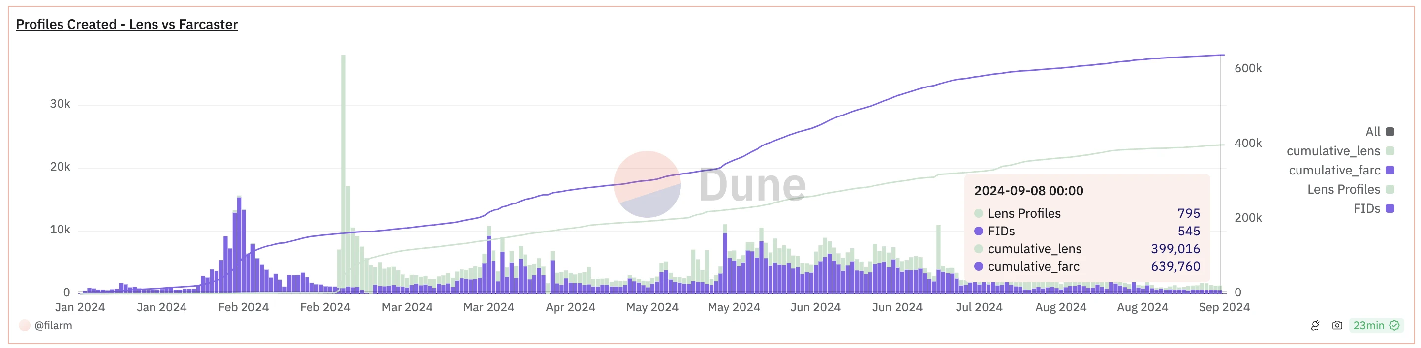 在那个时间节点,不少去中心化的信徒曾将 Fred 的宣言视为“去中心化社交即将爆发”的里程碑事件,但事后复盘来看,这却更像是“一轮行情的短线高点” 。自此之后的几个月内,从 friend.tech、Farcaster、Lens 等产品侧所观测到的流量都呈现出下滑趋势,而这一趋势则在今日随着上述两起热点事件的发酵与讨论而被更显性地呈现了出来。